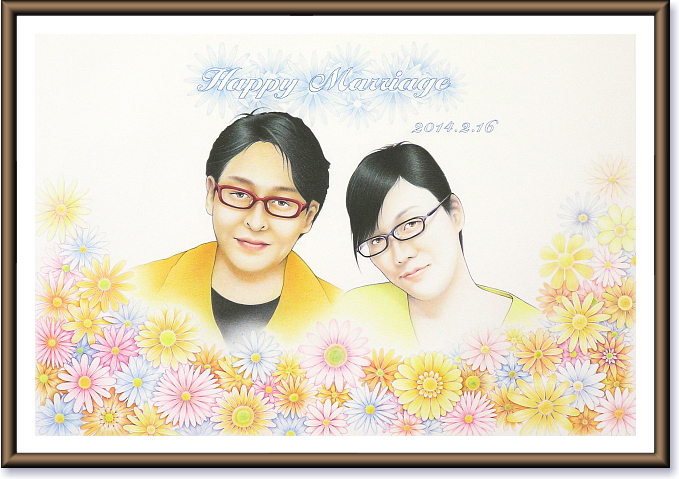 後輩からの依頼で描いたウェルカムボード。 [ 画材:ケント紙(A3)・色鉛筆 ] 私は趣味で自分の描きたいものを描いているだけなので、 依頼は丁重に お断りさせて頂いているのですが、今回は 地元の可愛い後輩からの頼みとあって、描かせて頂きました。 新郎である後輩は10年来の付き合いで、商工会青年部や消防団など 地域活動に共に参加してきた仲間です。 深い付き合いの友人には、是非とも幸せな結婚生活をおくってほしいと思うもの。 ウェルカムボードのタイトル文字は、「Happy wedding」や「Welcome to our party」などが 一般的です。これらは「結婚おめでとう」「私たちのパーティー(結婚式・二次会)にようこそ」 といった意味になりますが、私は「結婚したことを祝福する」というよりも、 「彼等の結婚生活が幸福であるりますように」と願って「Happy marriage」としました。 文字をあまり目立たせないようにアウトラインで仕上げたのは、自宅に飾った際に文字よりも 二人の顔が目に入り易くする意図と、自分のテクニック向上の為です。<塗り潰しで描く方が楽です。(^^; お祝いの雰囲気(装飾)は花をいっぱい描きましたが、これもリアルに成らないように、 ポップな感じでありながらも強弱や前後感を出して奥行き感を持たせました。 普段よりも大きなA3サイズで描いたので製作には3ヶ月掛かりましたが、良い勉強に成りました。 「お幸せに♪」 |